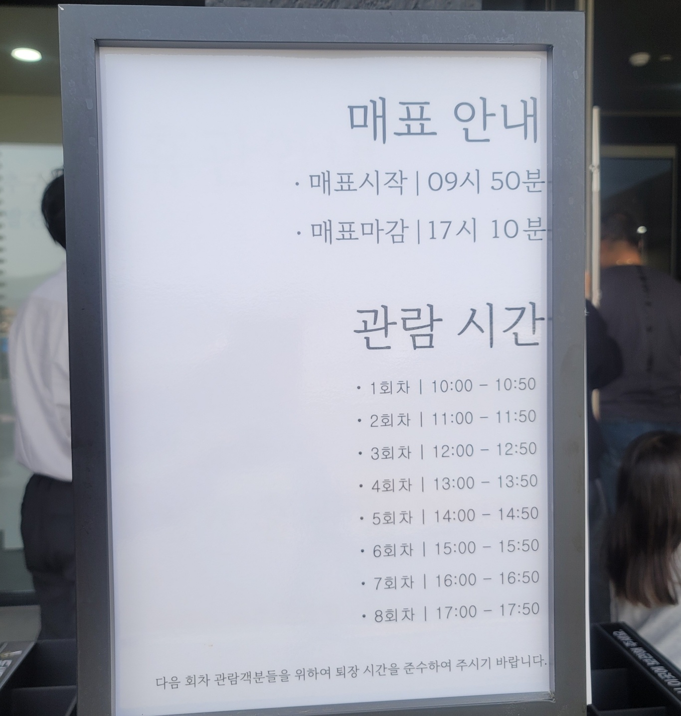 50분 부터 줄을서서 입장가능하다. 매표 순서와는 상관 없이 대기줄 순서로 입장하니 줄서야한다.